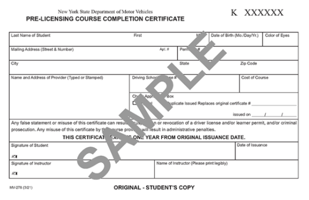 You will receive a MV-278 Pre-Licensing Course Completion Certificate. The MV-278 is proof that you've completed the mandatory 5-hour Pre-Licensing Course, which is a prerequisite for taking the road test to get a New York State driver's license.