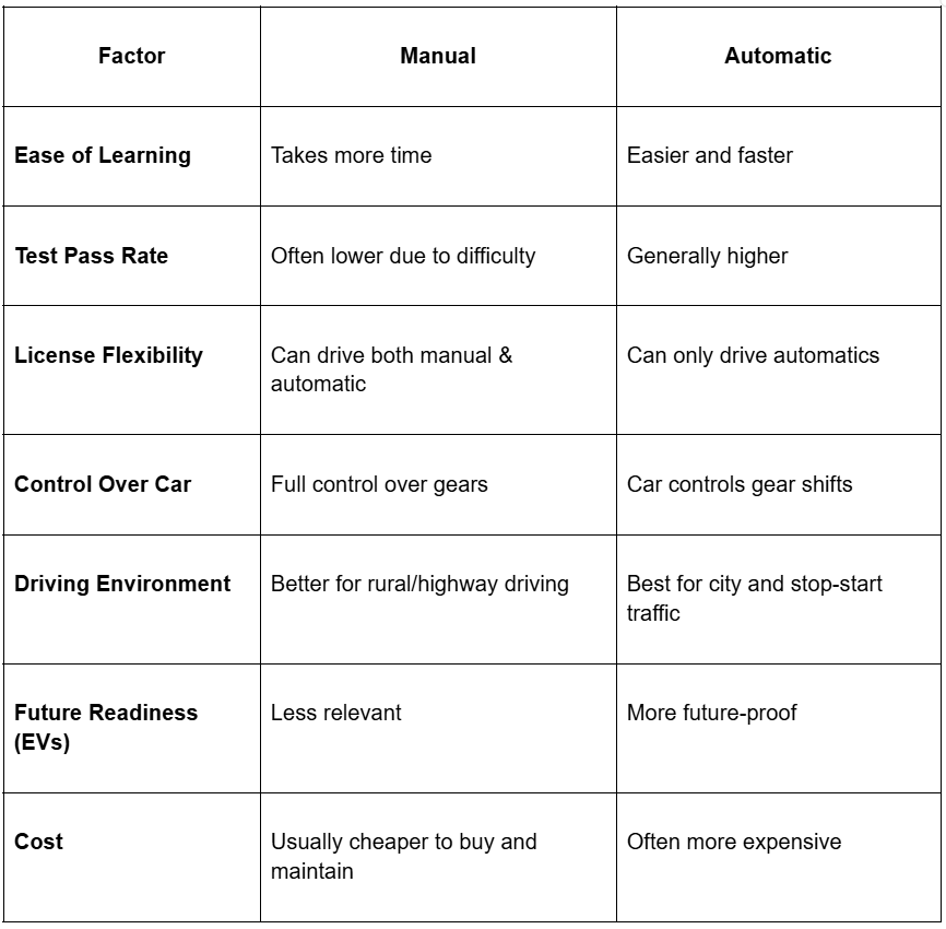 Some learners even choose to start with manual lessons, then transition to automatics later — giving them the best of both worlds.