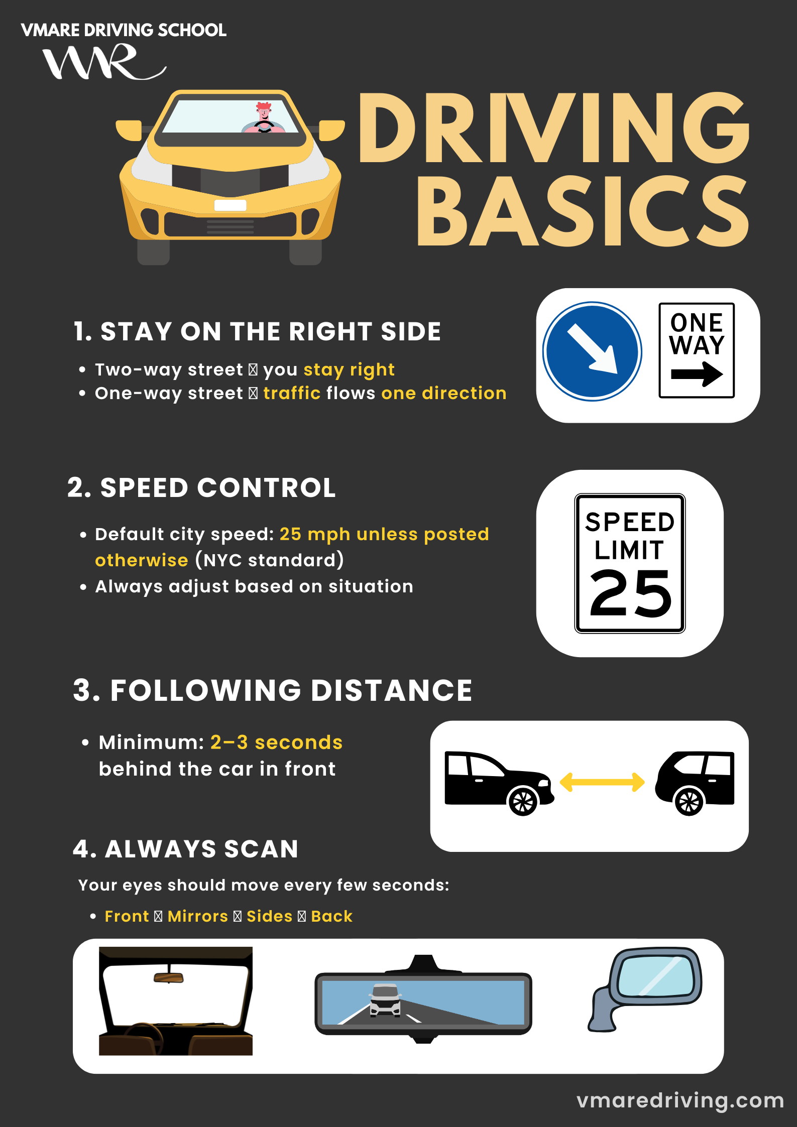 Here is your quick-review cheat sheet based on our core driving standards. Use this to study before your next lesson or your NYC road test!